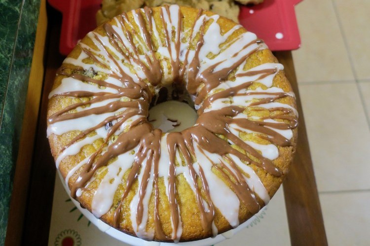 The sweet spread laid out-the loaf drizzled with vanilla and chocolate glazes