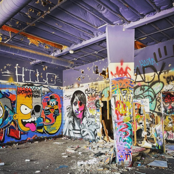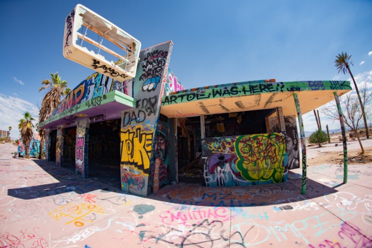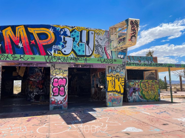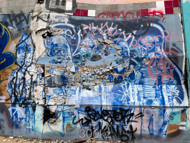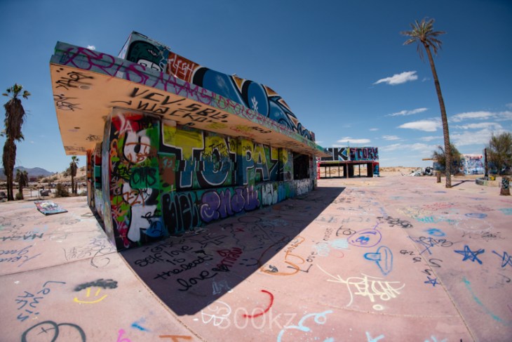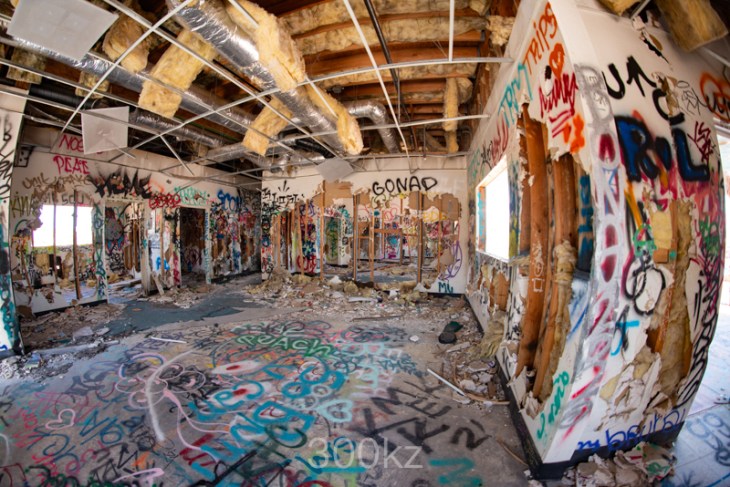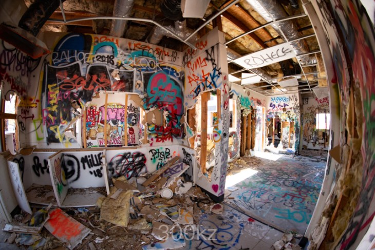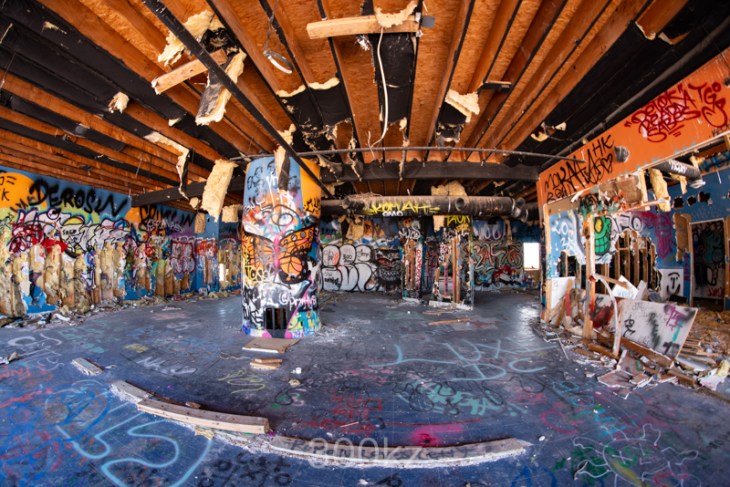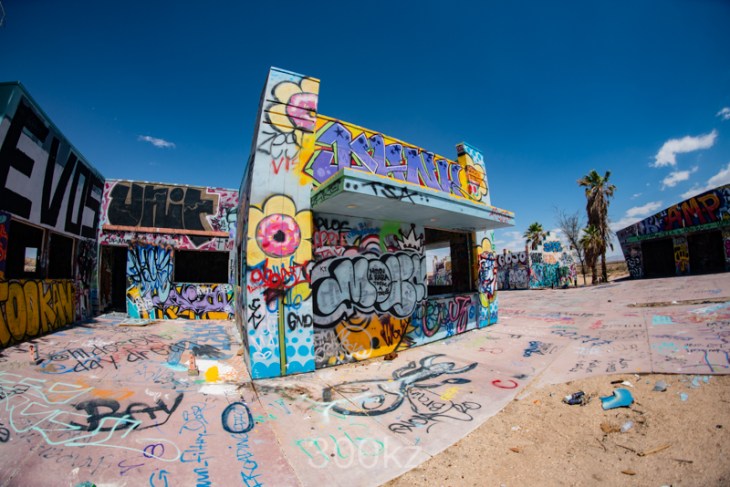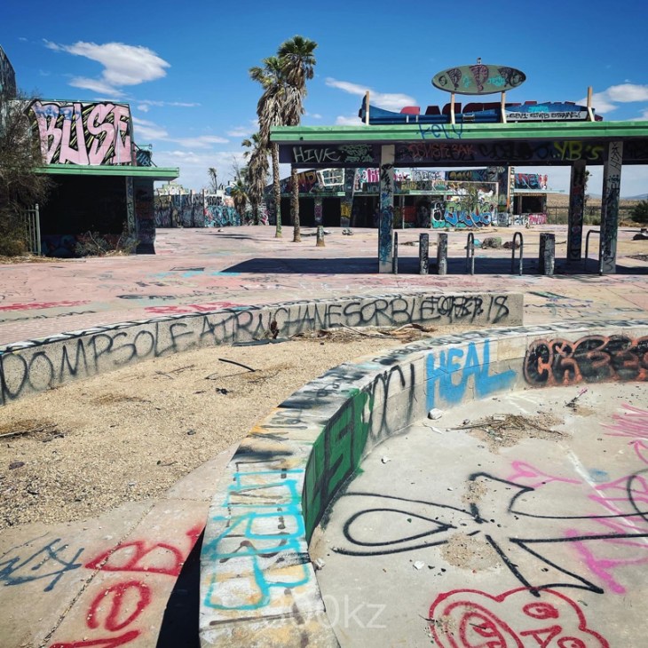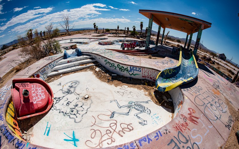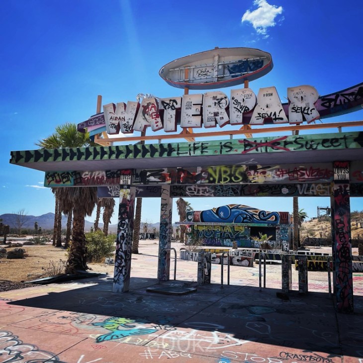 You would think that a waterpark in the Mojave Desert might have staying power-and it did from 1962 to 2002. During that time the renditions of the space, named Lake Dolores (after the manmade lake named after the owner’s wife), Rock–A–Hoola Waterpark (a version of the waterpark that blared Oldies from the 1950’s and 1960’s), and Discovery Waterpark through the years, utilized the 273 acre manmade lake fed by the area’s underground springs. Its rich history, both while active and after its closing, include ten 150-foot waterslides, a 200 foot zip line, a 20 foot high diving board, a lazy river, an all-night rave in 1999, an appearance in a Mtv reality show in 2008 and skate film in 2012, street art from the NYC-based TrustoCorp in 2013, and various other location appearance in television shows. Today, in 2021, I came to become part of its history. Clearly many more have also done so.