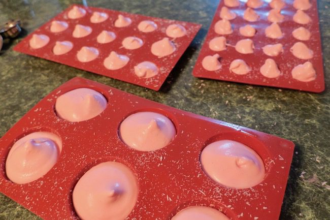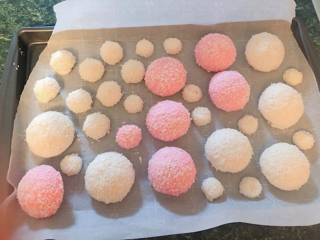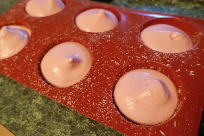 5.) Prep your molds. I used 3 different half-spherical molds. Coat interior of molds with a light mist of coconut oil spray. If it gets too oily, wipe down with a paper towel. You don’t want to jeopardize the texture of the marshmallows with too much oil. Then, coat with dried coconut. To prevent waste, I laid a baking sheet in the sink and took care to coat evenly, dumping and reusing excess coconut flakes. Put the baking sheet aside to coat marshmallows more thoroughly once they are removed from the molds.
