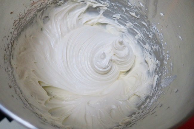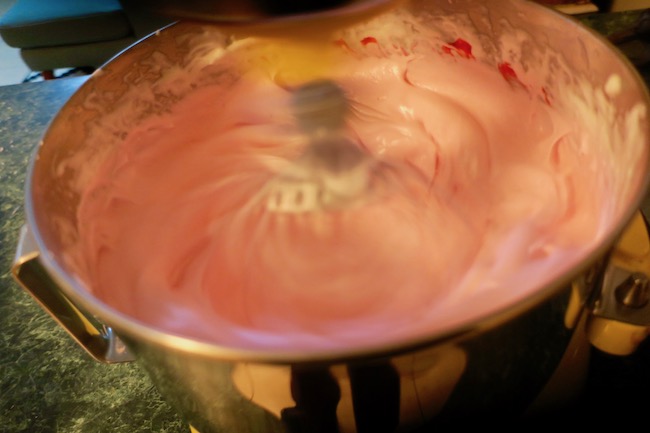 13.) Now let it whip well to combine. I had to scrape down the sides once to ensure all the thickening concoctions were incorporated. After 3 minutes, add the food coloring. After 5-7 minutes it should look ribbony and delicious.