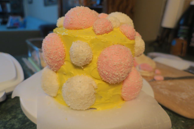 37.) I was pleased that the cream cheese frosting was thick. The pom poms did not fall off as I thought they might. I chose not to bake a domed cake like the original Pom Pom cake, I have never used a dome cake pan and didn’t want to put another layer of risk on this endeavor.