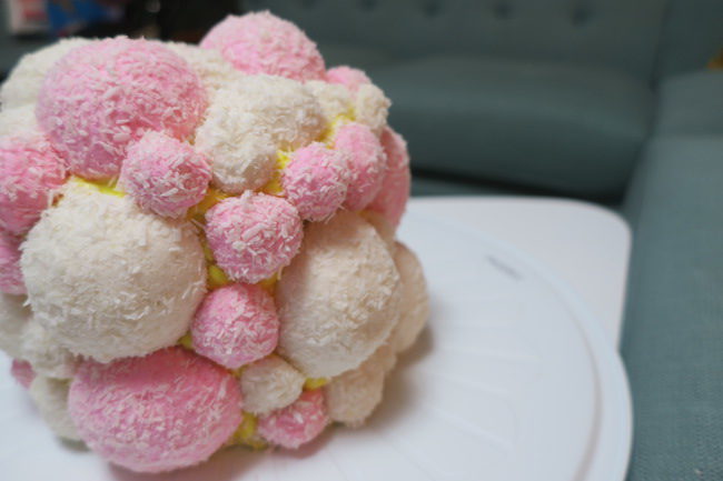 I wanted contrasting “pom poms” on top of my cake. Here are both of my batches, reminding me so much of a cookie I used to love as a kid. These came out so amazing that I want to put more pictures here.