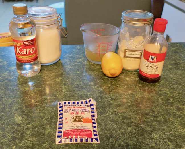 Aquafaba, xanthan gum, lemon juice, vanilla