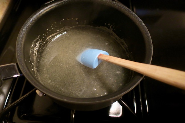 7.) Then, in the saucepan with the candy thermometer, add sugar, corn syrup and the rest of the water (6 TB). Let that sit for a few moments while you prep the stand-up mixer bowl.