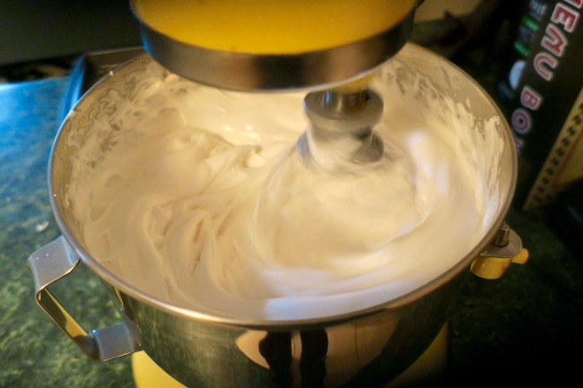 12.) Once sugar syrup mixture is at 120 C (248 F), take off heat and add to the chickpea mixture that’s whipping away. I lowered the speed only slightly and drizzled the syrup mixture in slowly and carefully, using a small rubber spatula to get all that sweetness in there. Let it whip 2 minutes and then add the agar mixture. You’ll definitely have to use a spatula to get it all out–it should be set loosely.