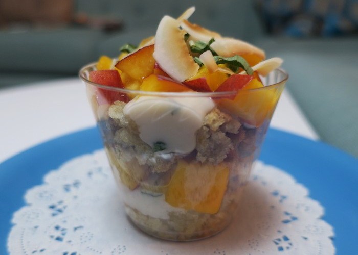 Allow coconut cream to come to room temperature or mix until smooth again. Layer cookie/cake, cream and fruit in a clear cup. Ration ingredients to create several sets of layers. Garnish appropriately. I used toasted coconut, basil and the fruit. Set in the fridge to set. Eat relatively soon after making.