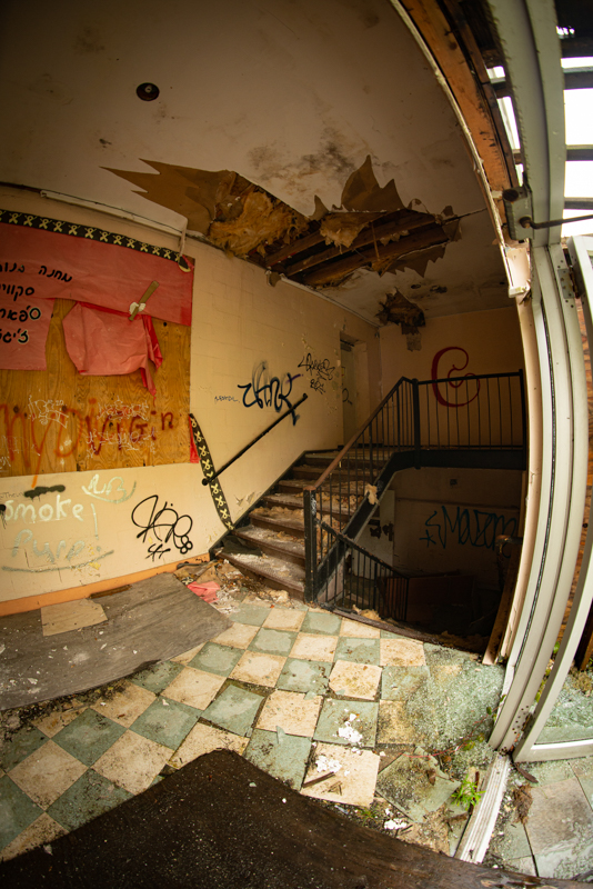 Though many of the complexes are now demolished, the Homowack Lodge is not. In fact, it has apparently earned Historical Landmark status as The Old Homowack Lodge-though I am not sure what that means for its care and maintenance. On my visit, after significant rain, the buildings were a cacophony of echoing drips and in-room waterfalls, unnervingly loud as I kept misperceiving them. The black mold that had attributed its closing from by the Health Department in 2009 when parts of the complex were utilized as Machne Bnos Square, a Hasidim girls camp, is now rampant.