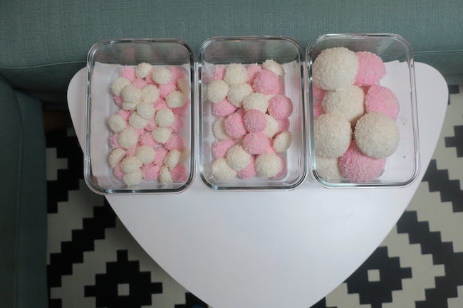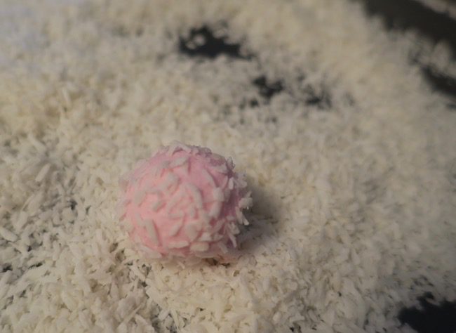 15.) Let them set for an hour at room temperature, uncovered. Then release them from the molds. They should release easily. Roll them about in the dried coconut. Try to resist eating them all. But this is rather difficult.