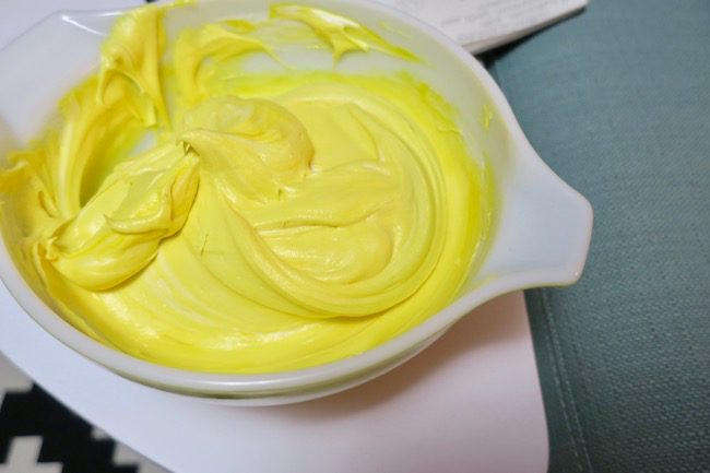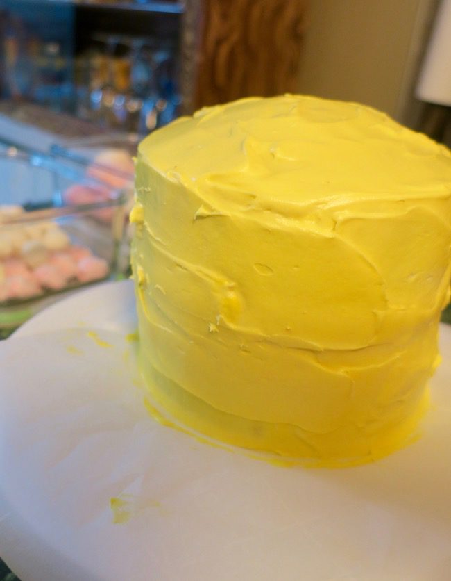 22.) Add the vanilla and beat until well incorporated. If you are adding food coloring, do it now. Clearly, I added a few drops of yellow. I did this because I wanted to contrast the two marshmallow shades and hint to the lemon flavor inside. Plus it’s a celebration cake!