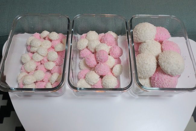 I wanted contrasting “pom poms” on top of my cake. Here are both of my batches, reminding me so much of a cookie I used to love as a kid. These came out so amazing that I want to put more pictures here.