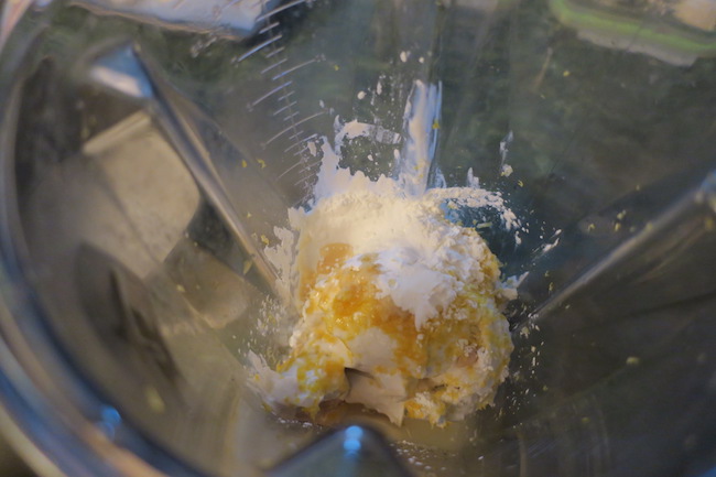 25.) Add coconut cream, corn starch, lemon juice, lemon zest, sea salt, and maple syrup to the blender and blend until smooth. Check for lemon-ness and sweetness and adjust if need be. Remember that are many components to this dessert and you don’t want it to be overly sweet.