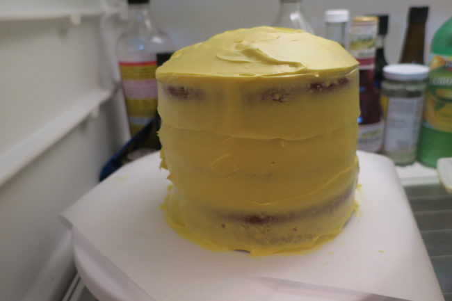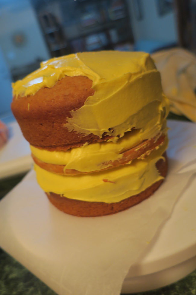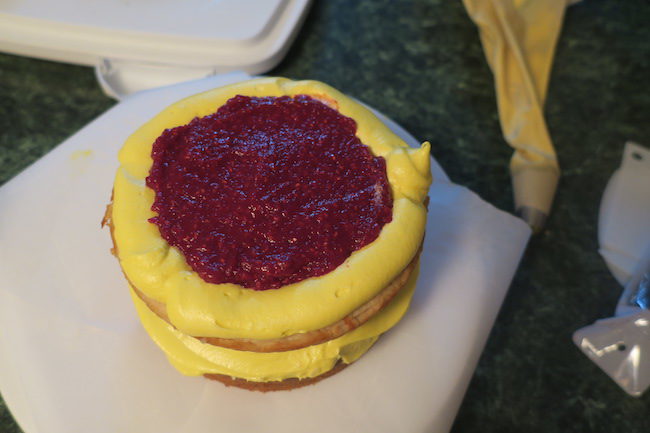 35) Put first layer of cake on a halved strip of parchment (so you can pull it from under cake easily afterwards.) Then add a layer of frosting + lemon layer (slightly chilled so it is a bit firm) + a piped perimeter of frosting + raspberry curd + cake layer 2.