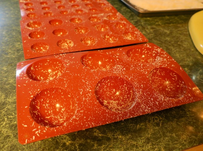 5.) Prep your molds. I used 3 different half-spherical molds. Coat interior of molds with a light mist of coconut oil spray. If it gets too oily, wipe down with a paper towel. You don’t want to jeopardize the texture of the marshmallows with too much oil. Then, coat with dried coconut. To prevent waste, I laid a baking sheet in the sink and took care to coat evenly, dumping and reusing excess coconut flakes. Put the baking sheet aside to coat marshmallows more thoroughly once they are removed from the molds.