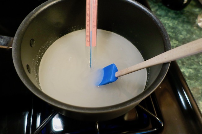 2.) Put two small saucepans on the stovetop. Affix one of the saucepans with a candy thermometer. There will only be a small amount of liquid in this saucepan, so a pan with too large a base will have you fiddling with the candy thermometer to ensure the red glob that detects the temperature is fully immersed in candy liquid. So let that help you determine the size of the saucepan.